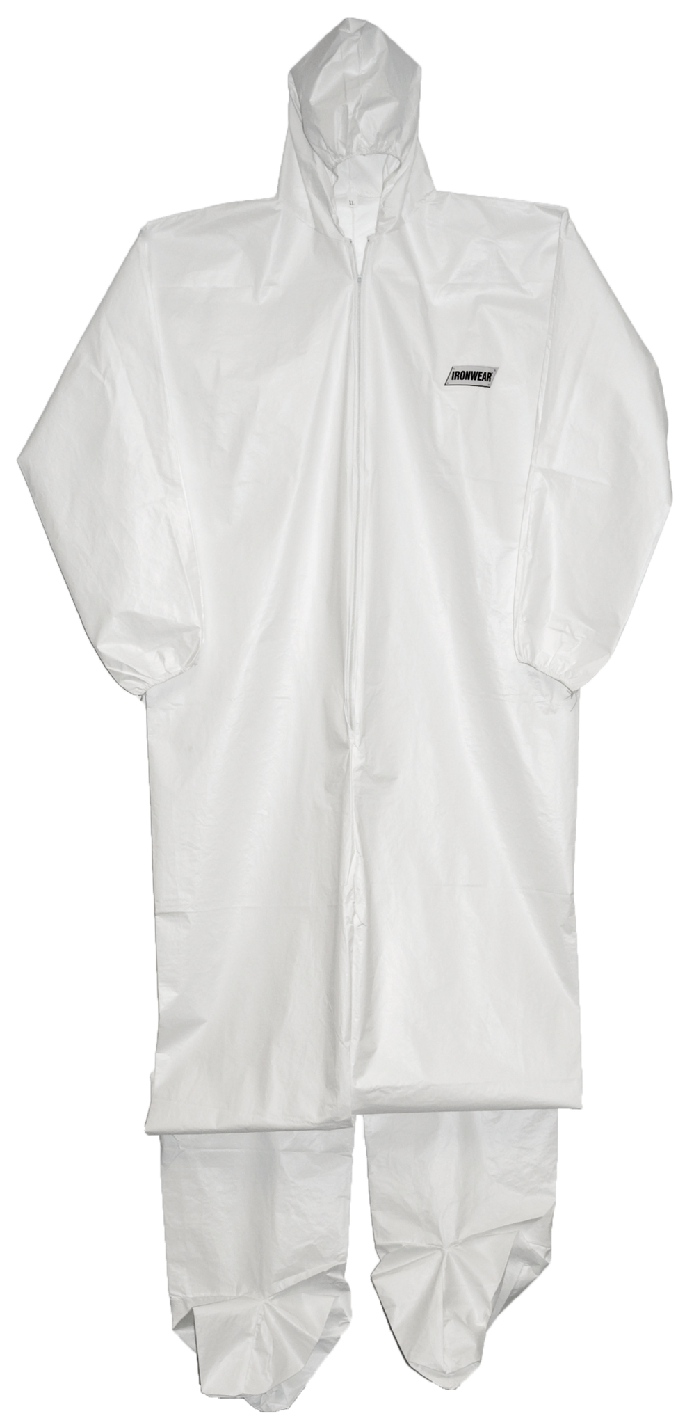 Ironwear Disposable protective apparel helps protect your workers against small size hazardous particles. That includes particles such as lead, asbestos, and mold. Protection is built into the fabric itself; there are no films or laminates to abrade or wear away. And for a better fit, 1640 garments with comfort fit design have been engineered for enhanced worker range of motion and durability in use. So whether performing asbestos abatement or installing insulation, we want to help you protect your workers. The 1640 is a zipper front coverall with collar, elastic sleeves, ankles, attached hood and boots