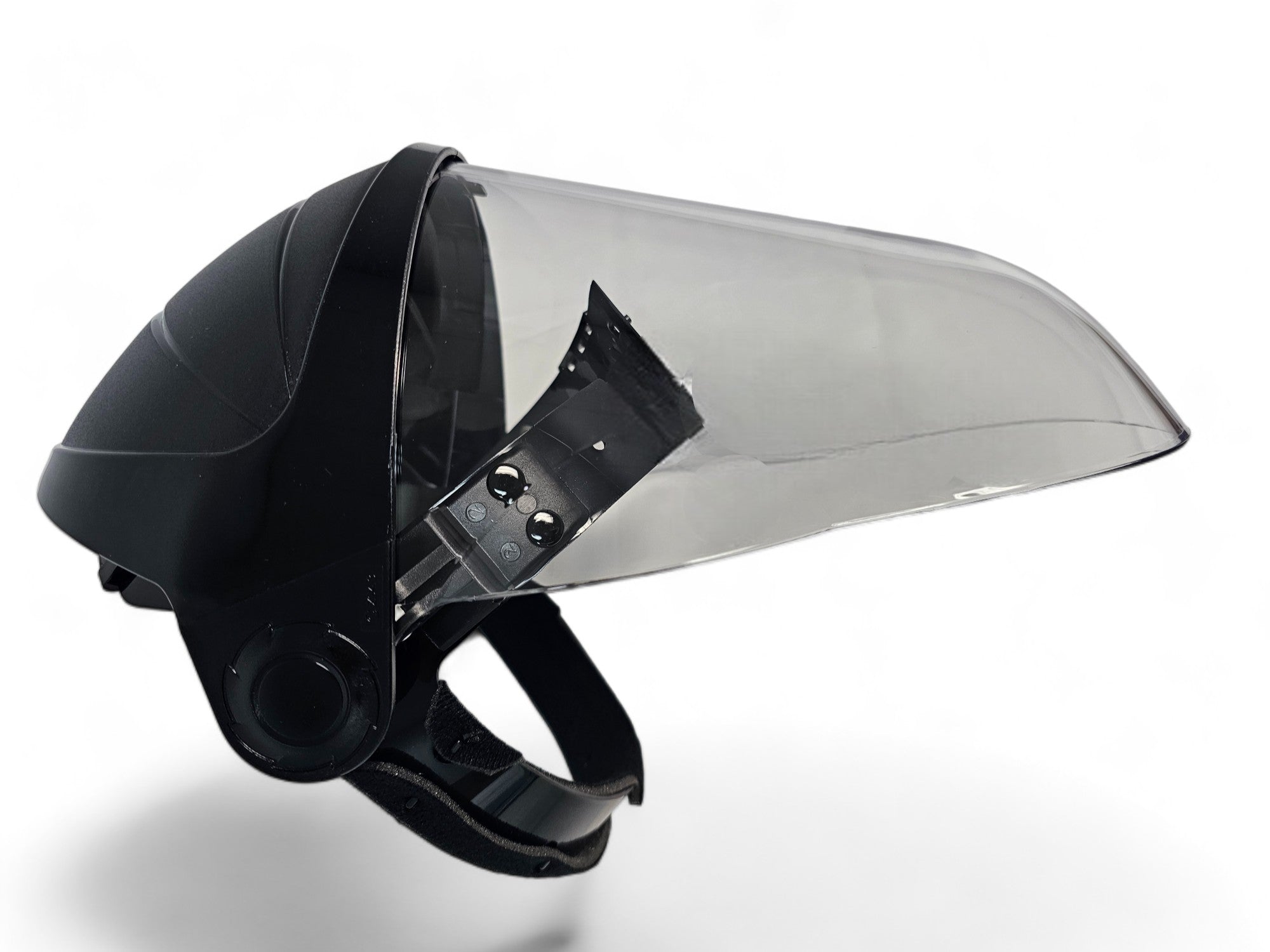 - Headgear with integrated, one-piece molded clear face shield