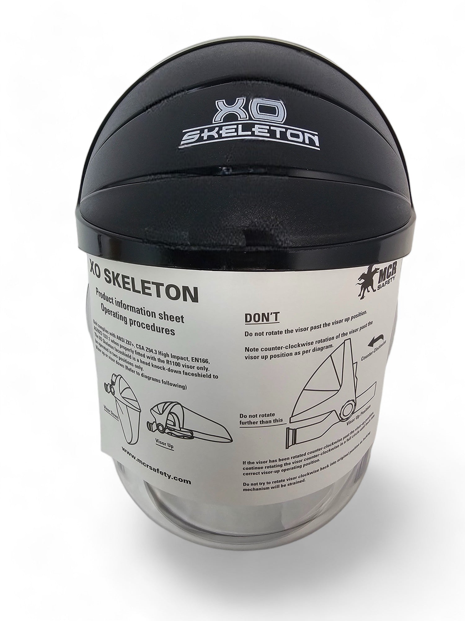 MCR Safety's headgear and face shields deliver exceptional protection against liquid splashes and flying debris, safeguarding the face from potential harm. With a variety of brackets and face shield sizes and materials, you can easily find the perfect option to meet your specific needs. The 104 XO Skeleton model features an integrated, one-piece molded polycarbonate face shield, ensuring superior optical clarity. The ratchet action adjustment, coupled with a terrycloth sweatband, guarantees both a precise fit and maximum comfort.