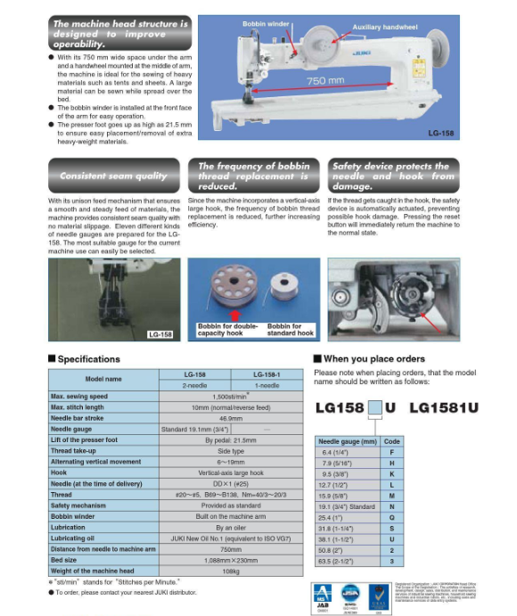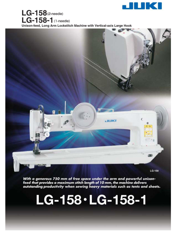 The JUKI LG-158 is a professional-grade, extra heavy-duty industrial sewing machine built for the most demanding applications. Featuring a 30-inch long arm, compound feed (triple feed) mechanism, and double needle lockstitch, this machine is ideal for sewing thick and bulky materials with precision and consistency.