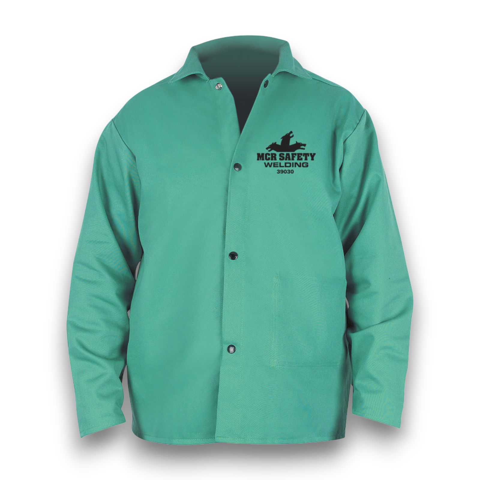 The MCR Safety 39030 green flame resistant welding jacket is designed to deliver dependable protection and comfort for welding and light hot-work applications. Constructed from 9 oz Excel FR fabric, this jacket provides economical flame resistant protection against light molten splash and sparks while remaining breathable and comfortable during extended wear.